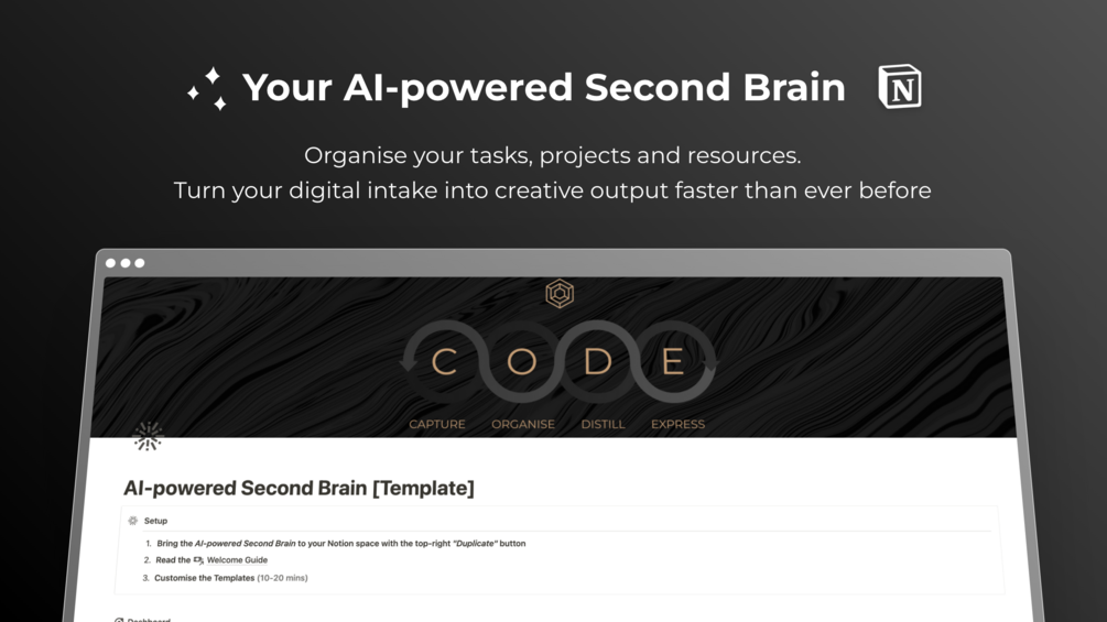 Built on Tiago Forte's Second Brain methodology and enhanced by Serj Hunt, this template combines structured workflows with AI-driven insights, following the P.A.R.A. system: Projects, Areas, Resources, and Archive.